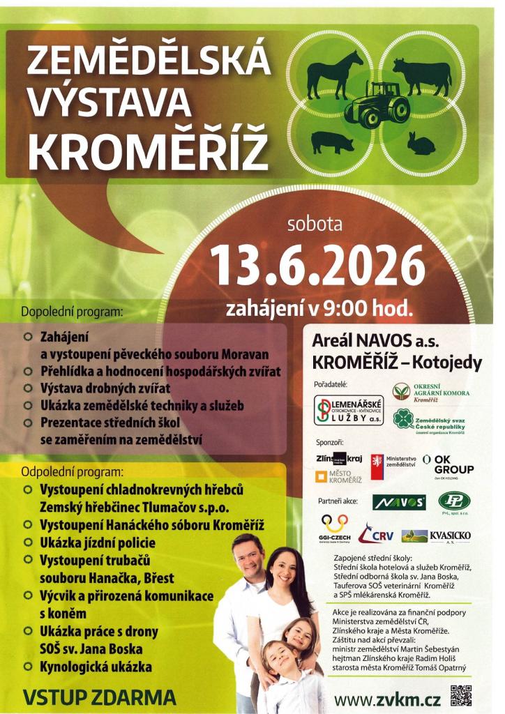 Zemědělská výstava Kroměříž se koná 13.6.2026 v areálu NAVOS a.s. Kroměříž - Kotojedy. Doprovodný program. Vstup zdarma.